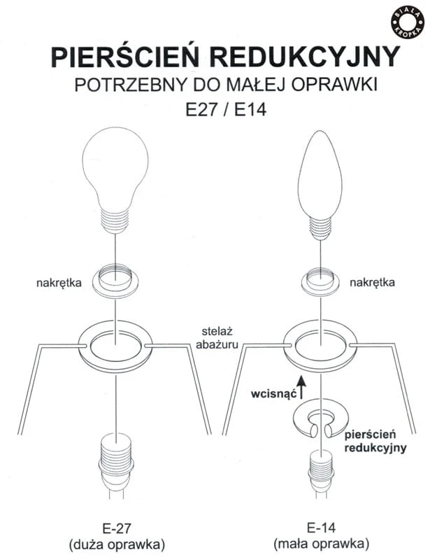 - MOCOWANIE: 1 x E27 (DUŻY GWINT, otwór 4,0 cm) z redukcją na E14 (MAŁY GWINT, otwór 2,8 cm)