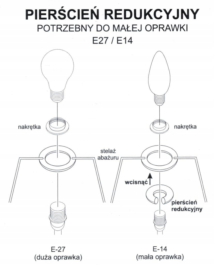 - MOCOWANIE: 1 x E27 (DUŻY GWINT, otwór 4,0 cm) z redukcją na E14 (MAŁY GWINT, otwór 2,8 cm)